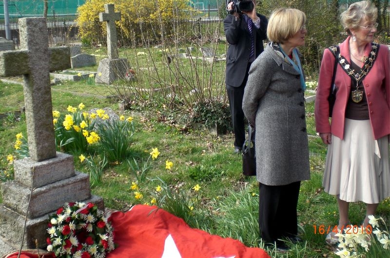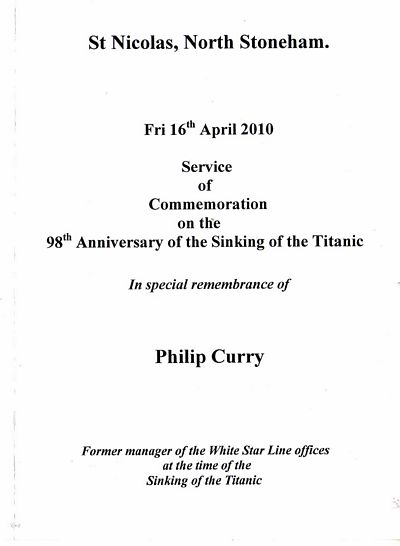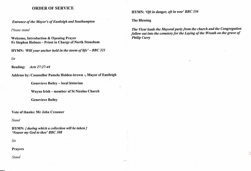 REPORT: "The Mayor of Eastleigh Councillor Mrs Pamela Holden-Brown and the Mayor of Southampton Councillor Mrs Elizabeth Mizon attended the White Star commemorative service in memory of Philip Curry who had served as the Southampton Manager based at Canute House. Mr Curry was in post when the Titanic sank in April 1912. The service held at St Nicholas Church, North Stoneham was followed by a wreath laying ceremony at the grave, the White Star flag from the Majestic covered the grave which volunteers had tidied up for the ceremony.